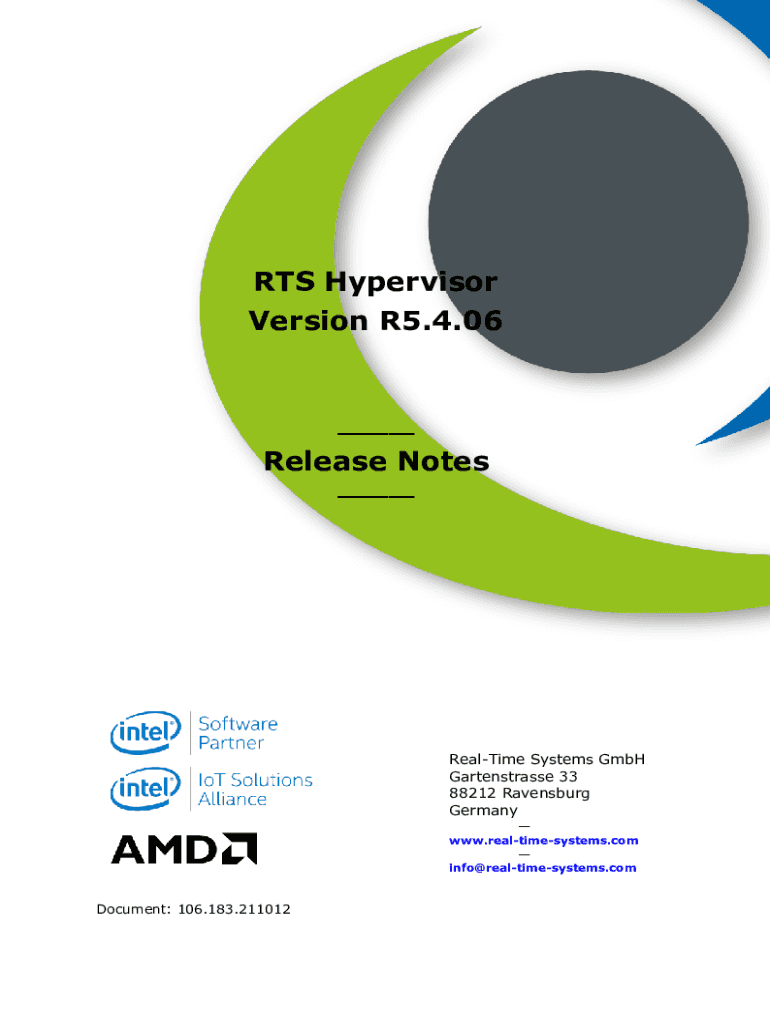 RTS Hypervisor Version R5.4.06___Release Notes ___RealTime Systems GmbH Gartenstrasse 33 88212 Ravensburg Germany www.realtimesystems.com info@realtimesystems.comDocument: 106.183.211012ALL RIGHTS
