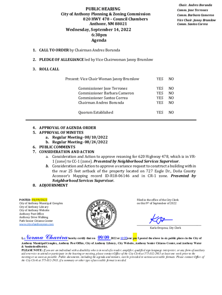 Chair. Andres BorundaPUBLIC HEARING City of Anthony Planning & Zoning Commission 820 HWY 478 Council Chambers Anthony, NM 88021 Wednesday, September 14, 2022 6:30pm AgendaComm. Jose Terrones Comm.