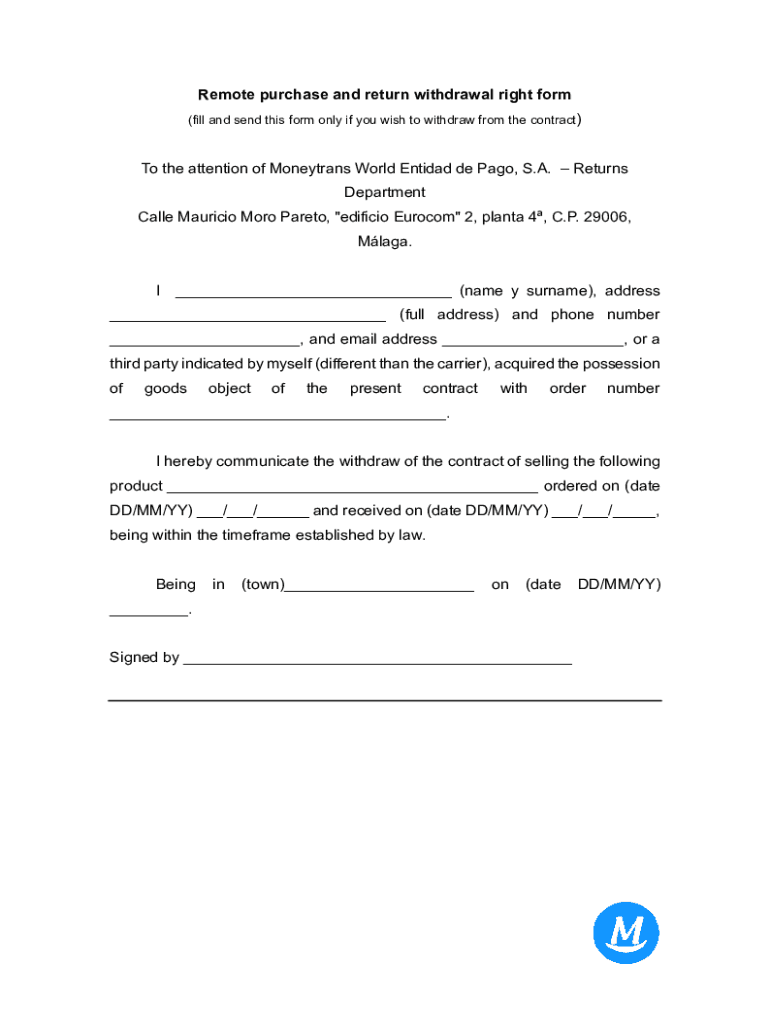 Remote purchase and return withdrawal right form (fill and send this form only if you wish to withdraw from the contract)To the attention of Moneytrans World Entidad de Pago, S.A. Returns Department