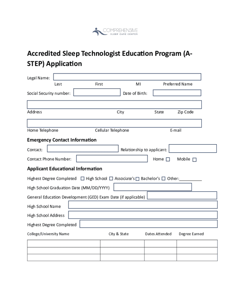 Accredited Sleep Technologist Education Program (ASTEP) Application Legal Name: LastFirstMISocial Security number:Date of Birth:AddressHome TelephonePreferred NameCityStateCellular TelephoneZip CodeEmailEmergency