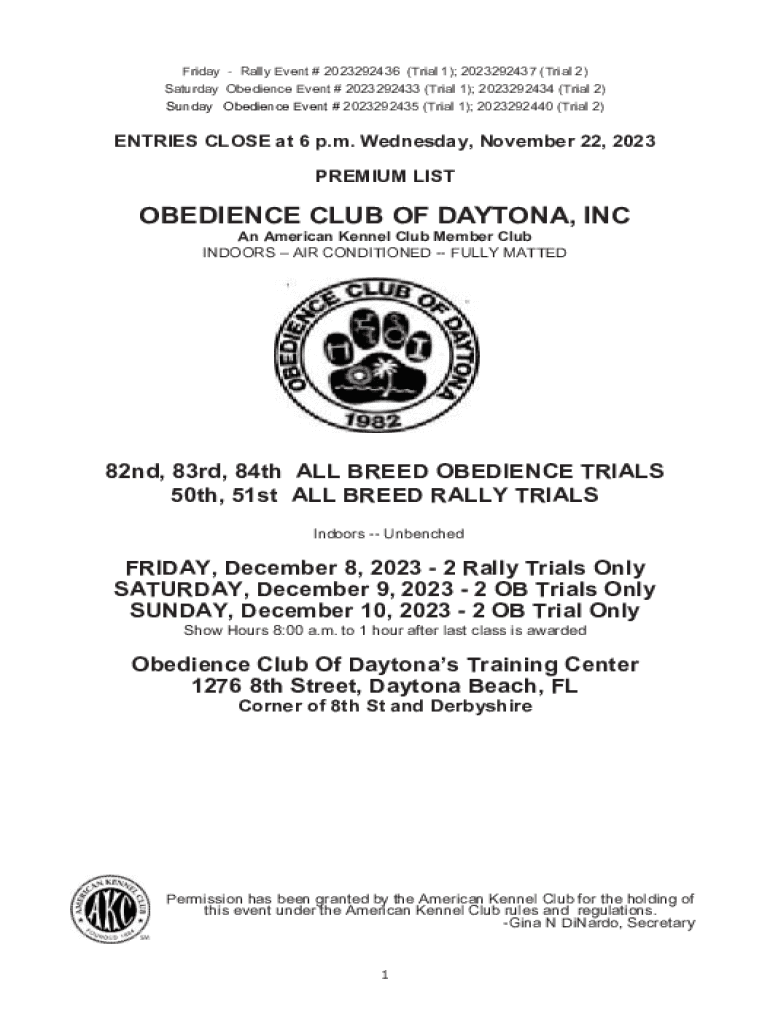 Friday Rally Event # 2023292436 (Trial 1); 2023292437 (Trial 2) Saturday Obedience Event # 2023292433 (Trial 1); 2023292434 (Trial 2) Sunday Obedience Event # 2023292435 (Trial 1); 2023292440 (Trial