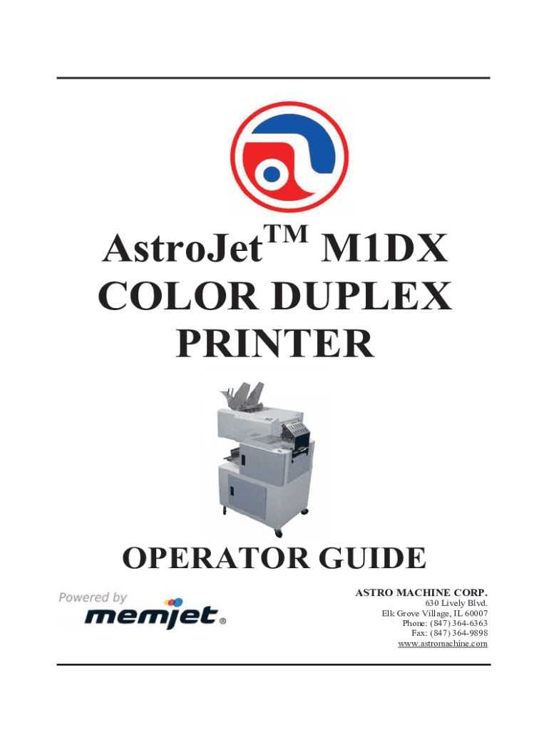 TMAstroJet M1DX COLOR DUPLEX PRINTEROPERATOR GUIDE ASTRO MACHINE CORP. 630 Lively Blvd. Elk Grove Village, IL 60007 Phone: (847) 3646363 Fax: (847) 3649898 www.astromachine.comSAFETY PRECAUTIONS THIS
