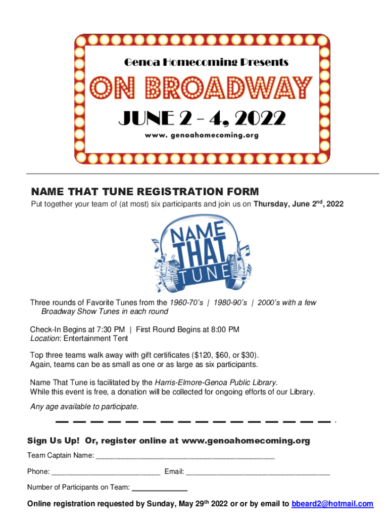 NAME THAT TUNE REGISTRATION FORM Put together your team of (at most) six participants and join us on Thursday, June 2nd, 2022Three rounds of Favorite Tunes from the 196070s | 198090s | 2000s with