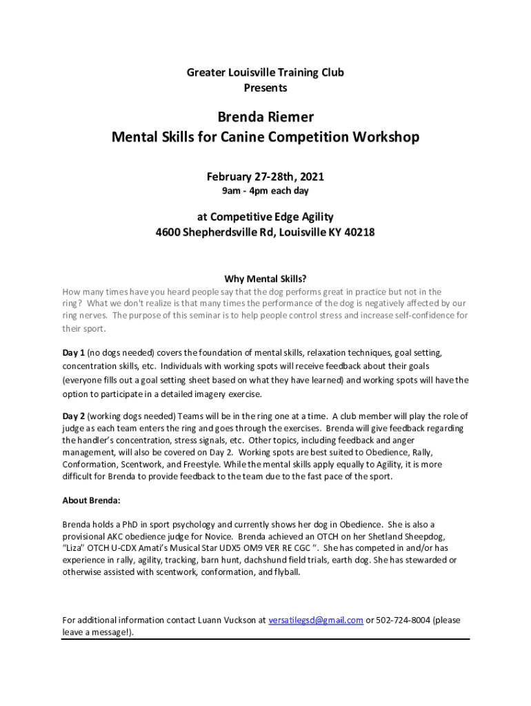 Greater Louisville Training Club PresentsBrenda Riemer Mental Skills for Canine Competition Workshop February 2728th, 2021 9am 4pm each dayat Competitive Edge Agility 4600 Shepherdsville Rd, Louisville