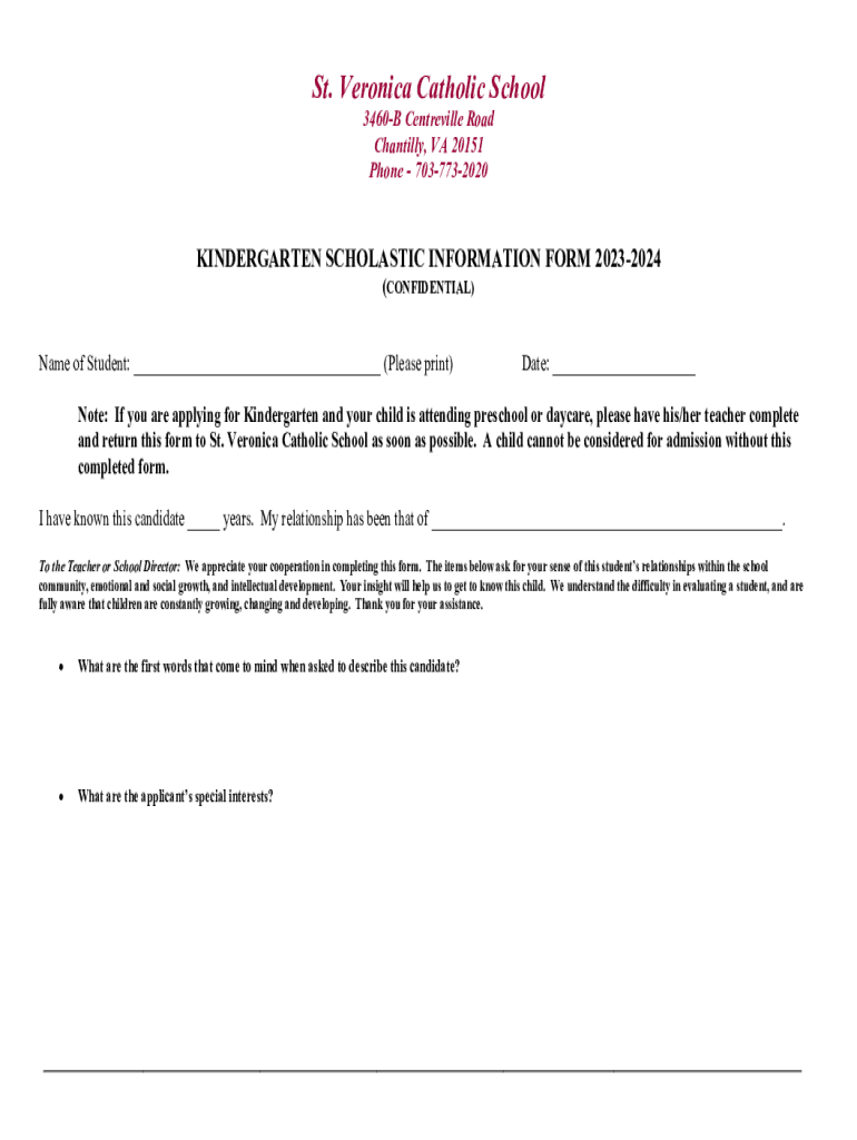 St. Veronica Catholic School 3460B Centreville Road Chantilly, VA 20151 Phone 7037732020KINDERGARTEN SCHOLASTIC INFORMATION FORM 20232024 (CONFIDENTIAL)Name of Student: ___ (Please print)Date: ___Note: