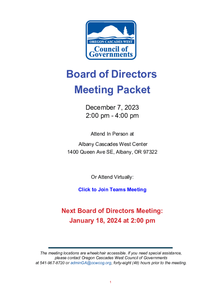 Board of Directors Meeting Packet December 7, 2023 2:00 pm 4:00 pm Attend In Person at Albany Cascades West Center 1400 Queen Ave SE, Albany, OR 97322Or Attend Virtually: Click to Join Teams MeetingNext