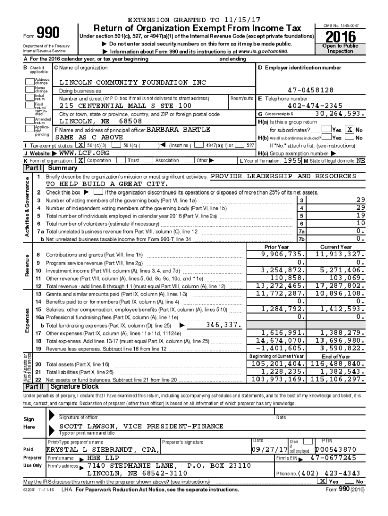 FormEXTENSION GRANTED TO 11/15/17990Return of Organization Exempt From Income TaxUnder section 501(c), 527, or 4947(a)(1) of the Internal Revenue Code (except private foundations)
