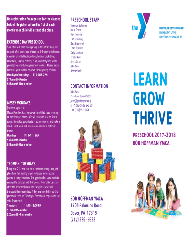 No registration fee required for the classes below! Register before the 1st of each month your child will attend the class.EXTENDED DAY PRESCHOOL Your child will learn through play in this structured,