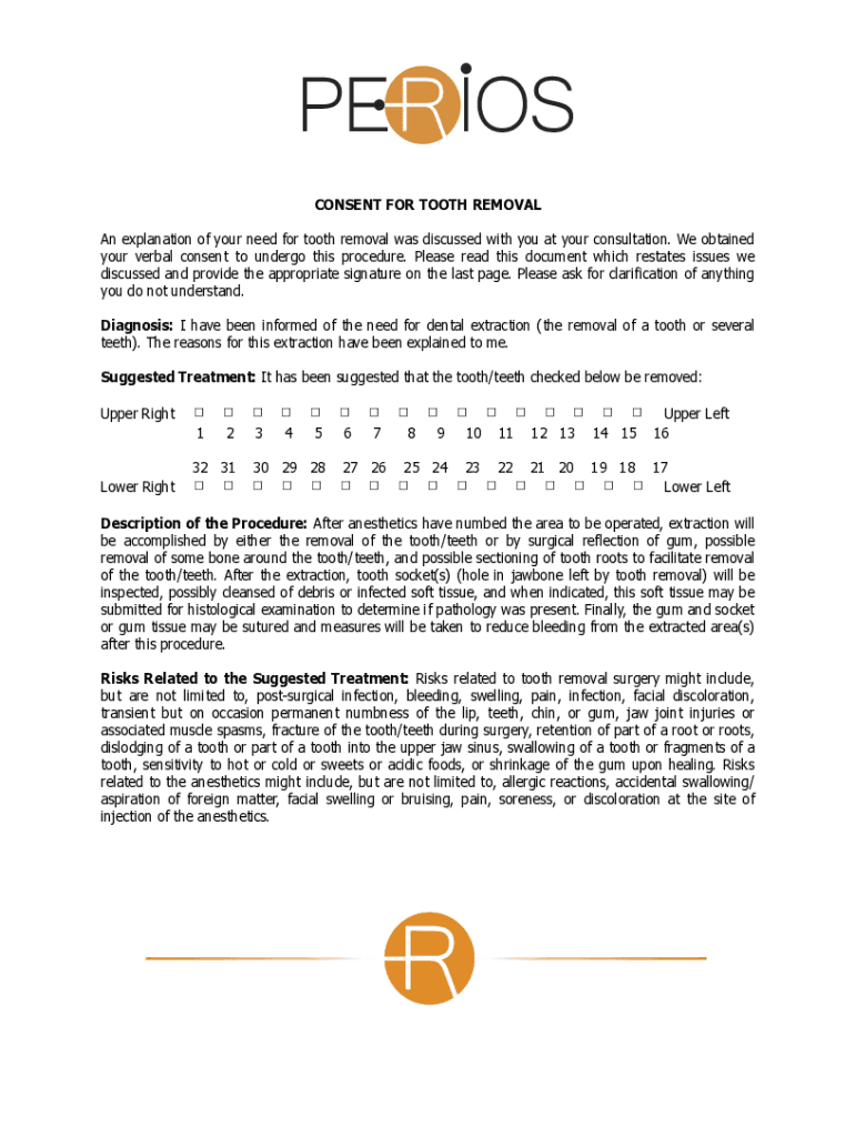 CONSENT FOR TOOTH REMOVAL An explanation of your need for tooth removal was discussed with you at your consultation. We obtained your verbal consent to undergo this procedure. Please read this document