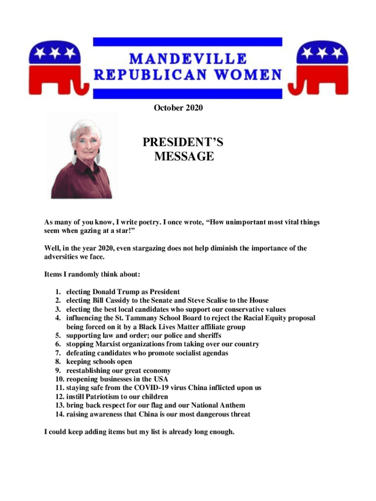 October 2020PRESIDENTS MESSAGEAs many of you know, I write poetry. I once wrote, How unimportant most vital things seem when gazing at a star! Well, in the year 2020, even stargazing does not help