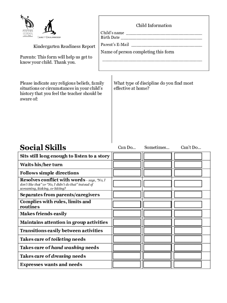 Child Information Childs name ___ Birth Date ___Kindergarten Readiness Report Parents: This form will help us get to know your child. Thank you.Parents EMail ___Name of person completing this form