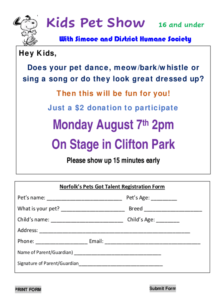 Kids Pet Show16 and underWith Simcoe and District Humane Society Hey Kids, Does your pet dance, meow/bark/whistle or sing a song or do they look great dressed up? Then this will be fun for you! Just