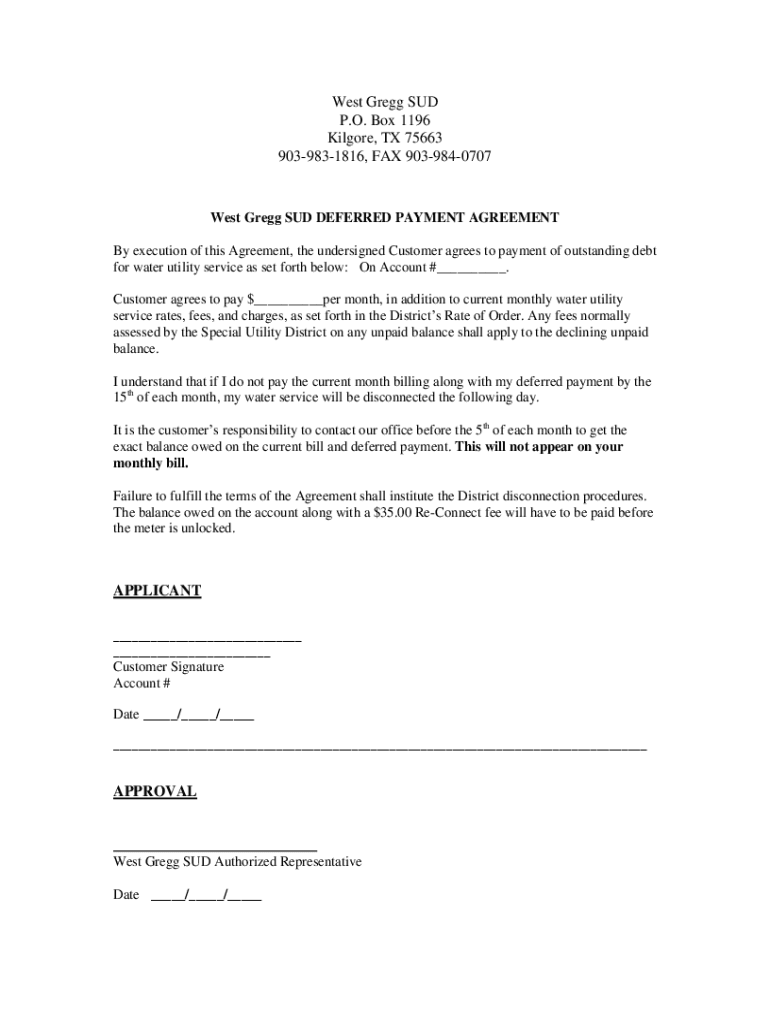 West Gregg SUD P.O. Box 1196 Kilgore, TX 75663 9039831816, FAX 9039840707West Gregg SUD DEFERRED PAYMENT AGREEMENT By execution of this Agreement, the undersigned Customer agrees to payment of outstanding