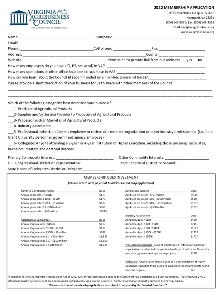 2022 MEMBERSHIP APPLICATION 9323 Midlothian Turnpike, Suite T Richmond, VA 23235 (804) 6433555; Fax: (804) 6433556 Email: vac@vaagribusiness.org www.vaagribusiness.orgName___ Company:___ Email: ___