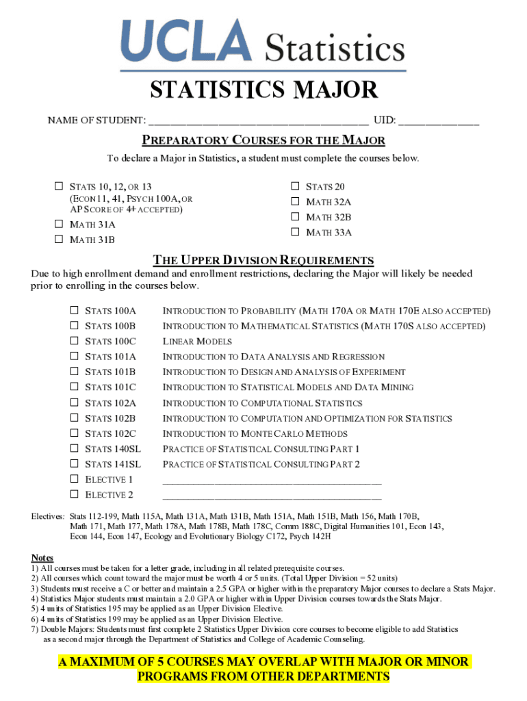 STATISTICS MAJOR NAME OF STUDENT: ___ UID: ___PREPARATORY COURSES FOR THE MAJOR To declare a Major in Statistics, a student must complete the courses below. STATS 10, 12, OR 13 (ECON 11, 41, PSYCH