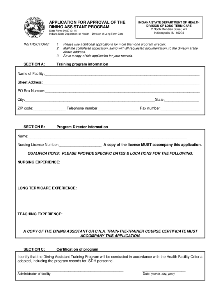 APPLICATION FOR APPROVAL OF THE DINING ASSISTANT PROGRAM State Form 54667 (311) Indiana State Department of Health Division of Long Term CareINSTRUCTIONS:1. 2. 3.SECTION A:INDIANA STATE DEPARTMENT