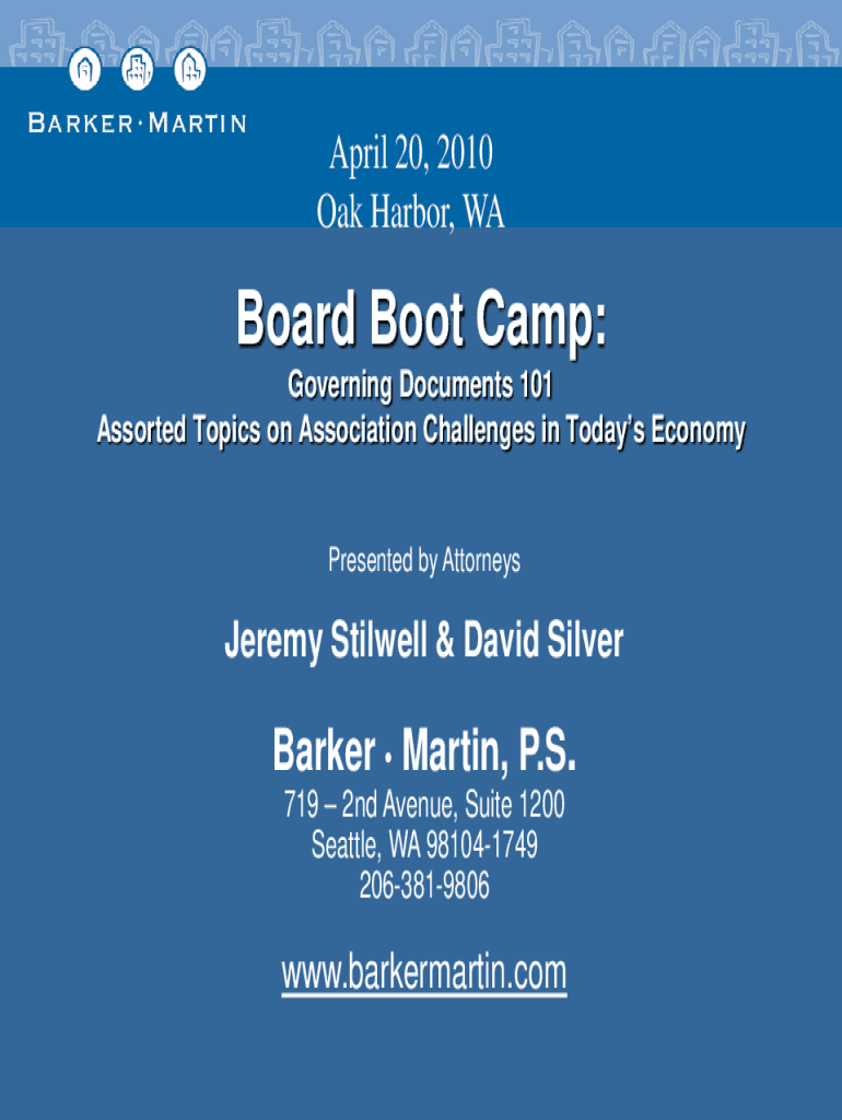 April 20, 2010 Oak Harbor, WABoard Boot Camp: Governing Documents 101 Assorted Topics on Association Challenges in Todays EconomyPresented by AttorneysJeremy Stilwell & David SilverBarker Martin,