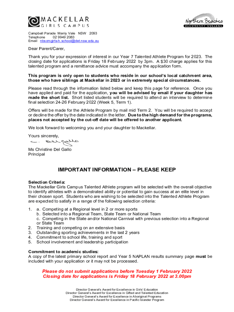 Campbell Parade Manly Vale NSW 2093 Telephone 02 9949 2083 Email nbscmgirlsh.school@det.nsw.edu.auDear Parent/Carer, Thank you for your expression of interest in our Year 7 Talented Athlete Program