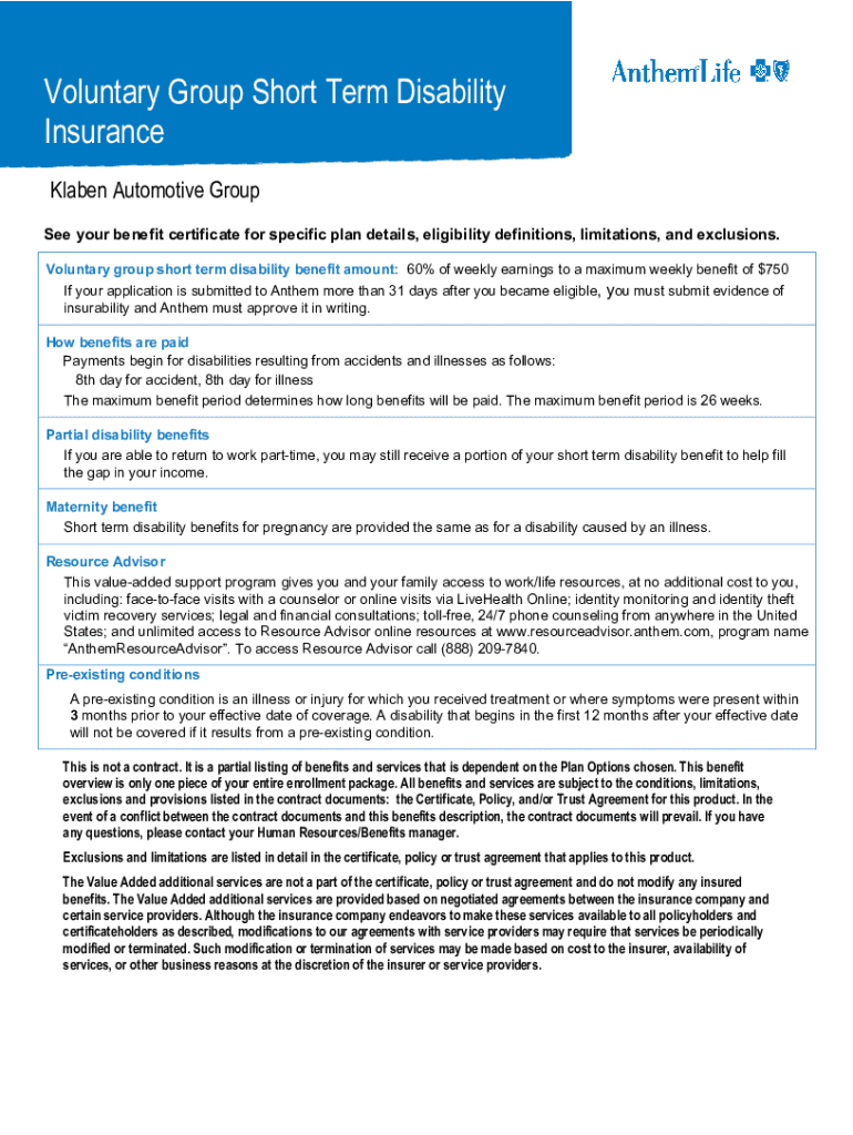 Voluntary Group Short Term Disability Insurance Klaben Automotive Group See your benefit certificate for specific plan details, eligibility definitions, limitations, and exclusions. Voluntary group