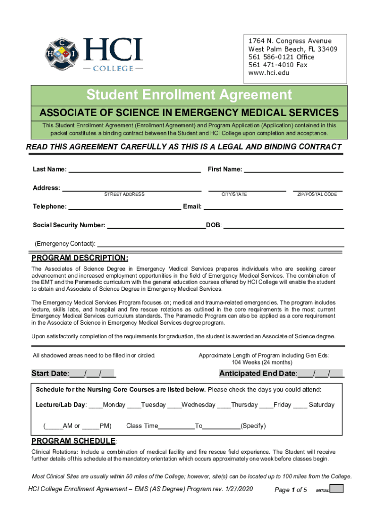1764 N. Congress Avenue West Palm Beach, FL 33409 561 5860121 Office 561 4714010 Fax www.hci.eduStudent Enrollment Agreement ASSOCIATE OF SCIENCE IN EMERGENCY MEDICAL SERVICES This Student Enrollment