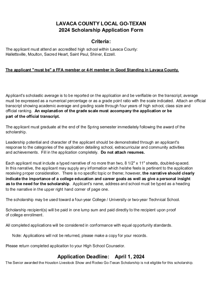 LAVACA COUNTY LOCAL GOTEXAN 2024 Scholarship Application Form Criteria: The applicant must attend an accredited high school within Lavaca County: Hallettsville, Moulton, Sacred Heart, Saint Paul,