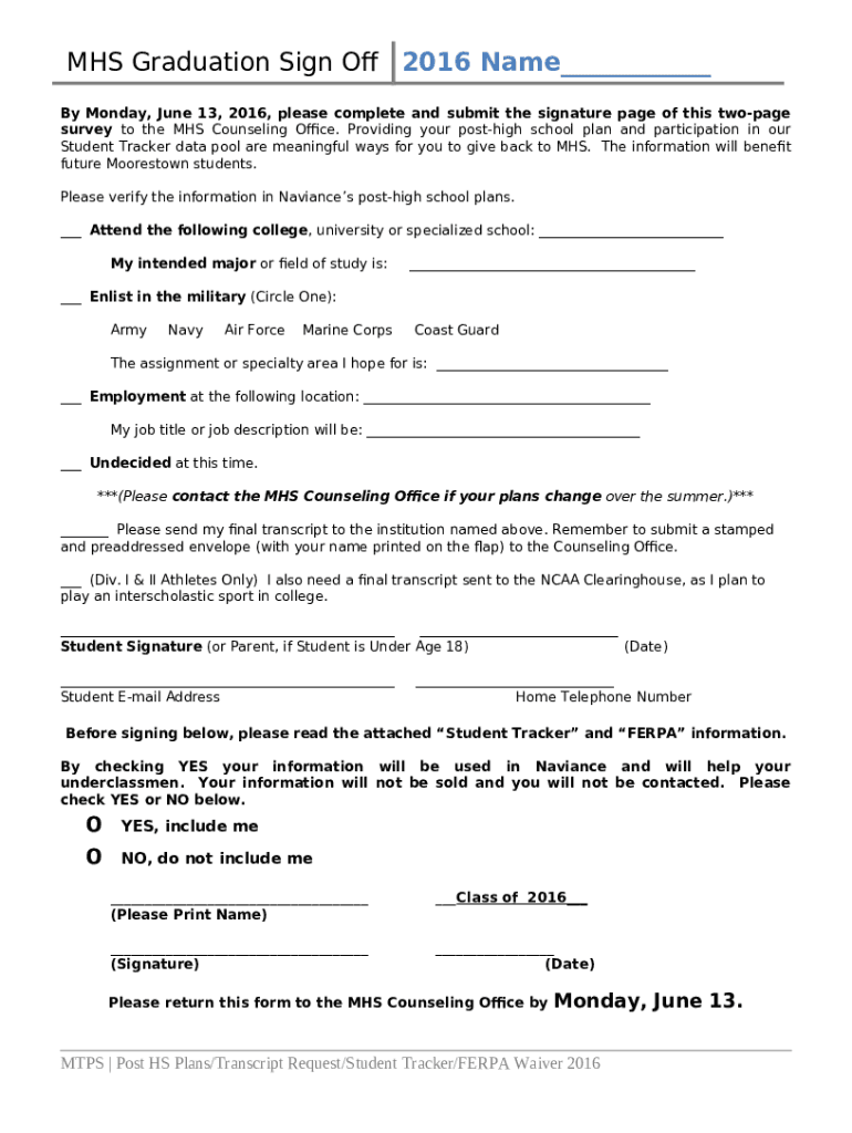 The By Monday, June 13, 2016, please complete and submit the signature page of this two-page survey to the MHS Counseling Office is a Word document you can get filled-out and signed for certain needs. In that case, it is furnished to the exact addressee in order to provide certain details of any kinds. The completion and signing is able or using a trusted application like PDFfiller. Such tools help to send in any PDF or Word file without printing out. It also lets you customize it for your requirements and put a valid digital signature. Upon finishing, you send the By Monday, June 13, 2016, please complete and submit the signature page of this two-page survey to the MHS Counseling Office to the respective recipient or several recipients by mail or fax. PDFfiller has got a feature and options that make your document of MS Word extension printable. It offers various settings when printing out. No matter, how you will deliver a document - in hard copy or by email - it will always look professional and clear. To not to create a new writable document from the beginning every time, turn the original file as a template. Later, you will have an editable sample.