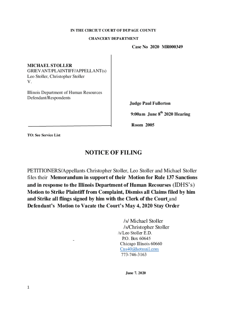 IN THE CIRCIUT COURT OF DUPAGE COUNTY CHANCERY DEPARTMENTCase No 2020 MR000349MICHAEL STOLLER GRIEVANT/PLAINTIFF/APPELLANT(s) Leo Stoller, Christopher Stoller V. Illinois Department of Human Resources