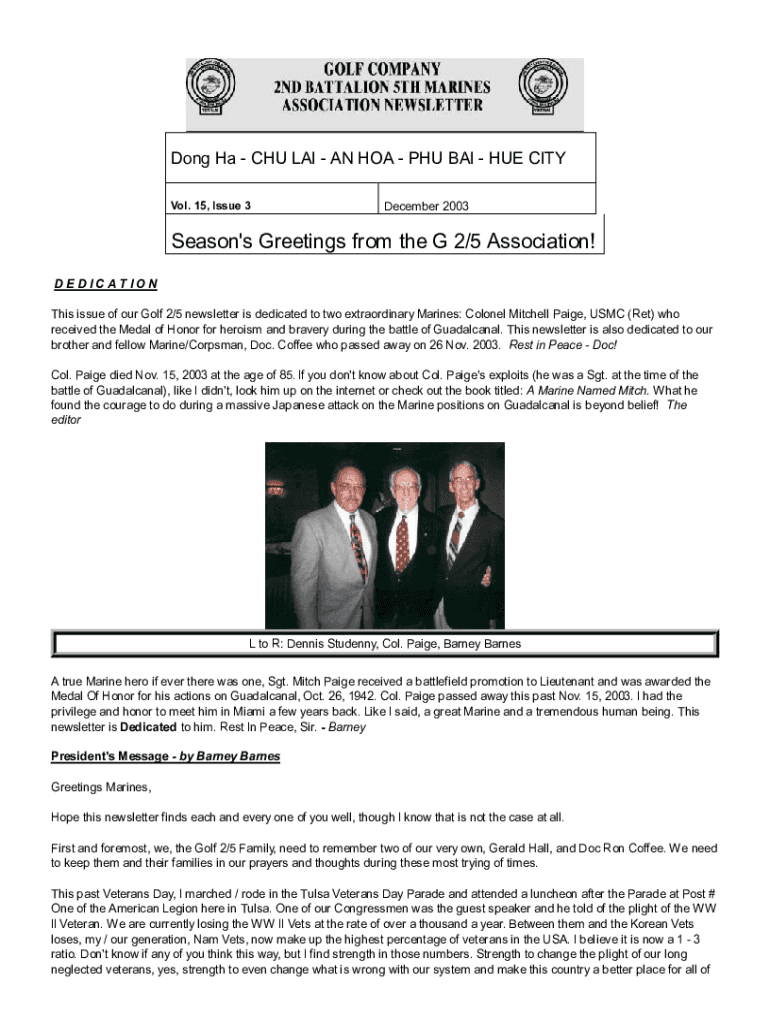 Dong Ha CHU LAI AN HOA PHU BAI HUE CITY Vol. 15, Issue 3December 2003Season\'s Greetings from the G 2/5 Association! D ED IC A T ION This issue of our Golf 2/5 newsletter is dedicated to two extraordinary