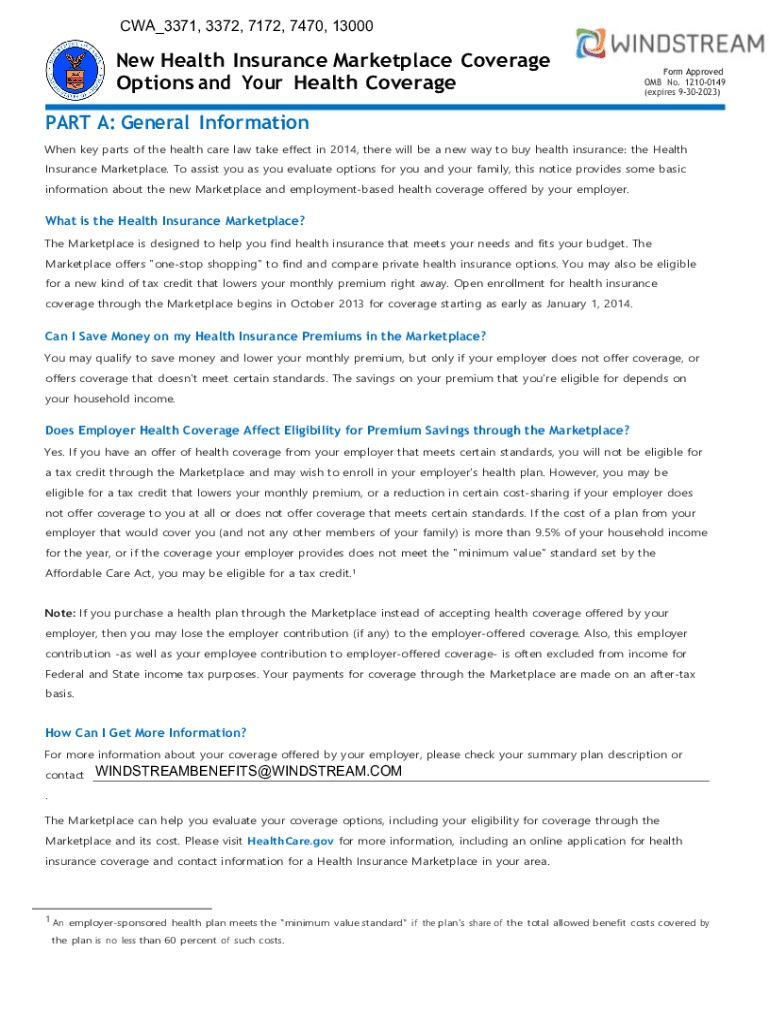 CWA_3371, 3372, 7172, 7470, 13000New Health Insurance Marketplace Coverage Options and Your Health CoverageForm Approved OMB No. 12100149 (expires 9302023)PART A: General Information When key parts