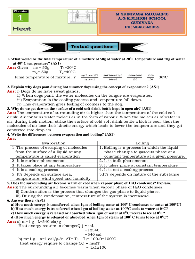 M.SRINIVASA RAO,SA(PS) A.G.K.M.HIGH SCHOOL GUDIVADA PH: 9848143855Textual questions 1. What would be the final temperature of a mixture of 50g of water at 200C temperature and 50g of water at 400