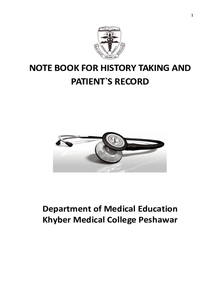 1NOTE BOOK FOR HISTORY TAKING AND PATIENT`S RECORDDepartment of Medical Education Khyber Medical College Peshawar2History S. No___,Unit:___,Date:___Biodata Patient name:Age:Marital status: Presenting