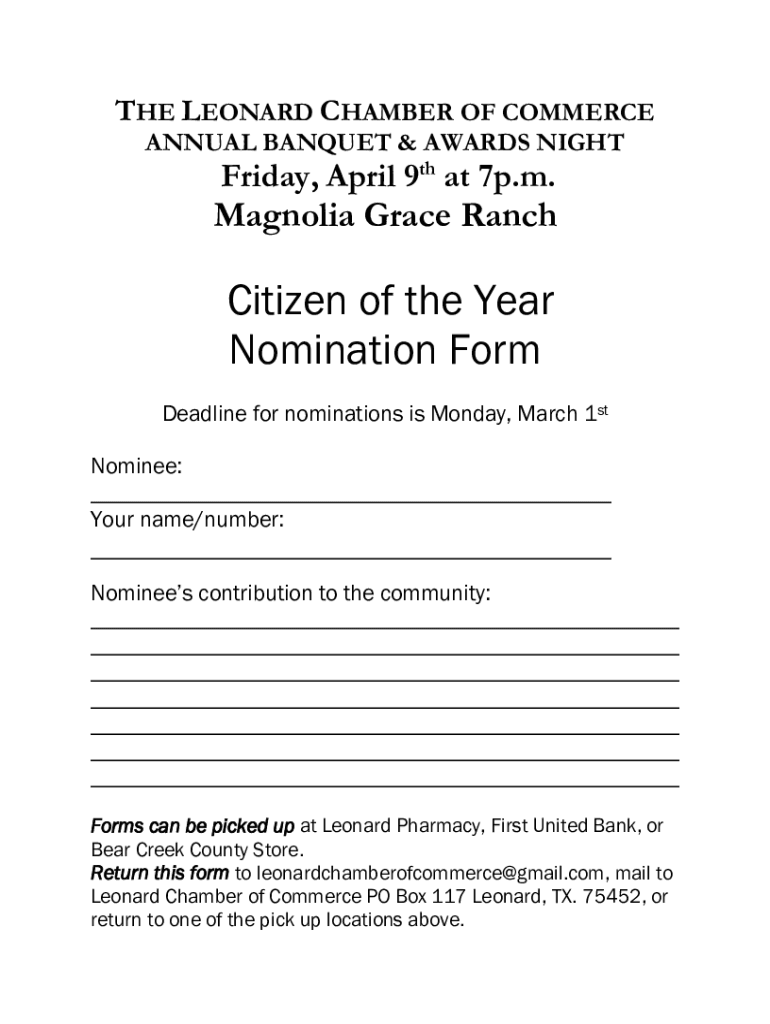 THE LEONARD CHAMBER OF COMMERCE ANNUAL BANQUET & AWARDS NIGHTFriday, April 9th at 7p.m.Magnolia Grace RanchCitizen of the Year Nomination Form Deadline for nominations is Monday, March 1st Nominee: