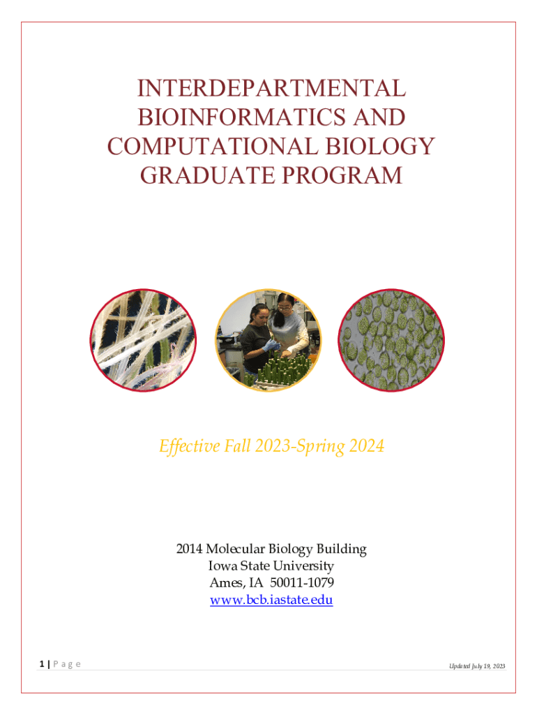 INTERDEPARTMENTAL BIOINFORMATICS AND COMPUTATIONAL BIOLOGY GRADUATE PROGRAMEffective Fall 2023Spring 20242014 Molecular Biology Building Iowa State University Ames, IA 500111079 www.bcb.iastate.edu1|PageUpdated