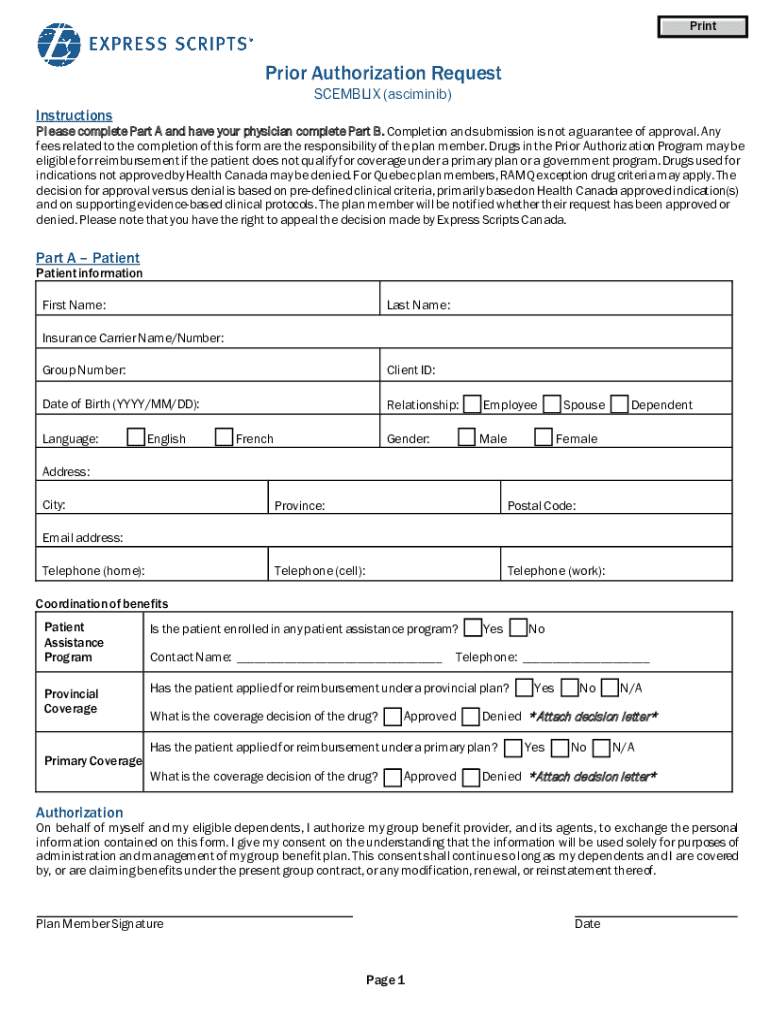ClearPrintPrior Authorization Request SCEMBLIX (asciminib)InstructionsPlease complete Part A and have your physician complete Part B. Completion and submission is not a guarantee of approval. Any