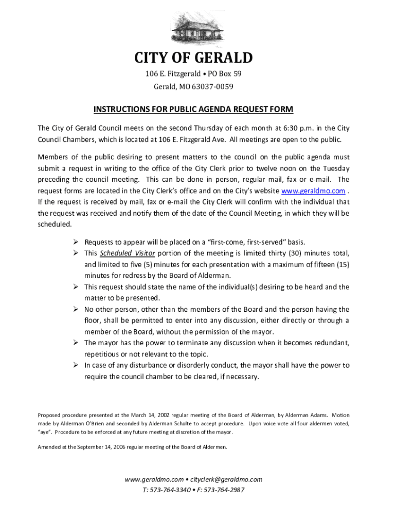 CITY OF GERALD 106 E. Fitzgerald PO Box 59 Gerald, MO 630370059INSTRUCTIONS FOR PUBLIC AGENDA REQUEST FORM The City of Gerald Council meets on the second Thursday of each month at 6:30 p.m. in the