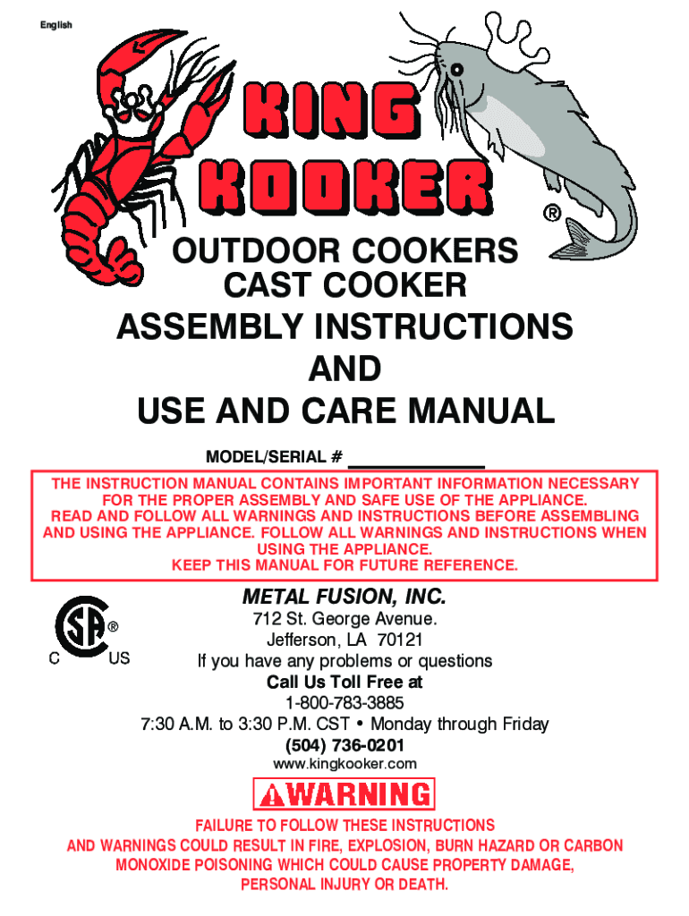 EnglishOUTDOOR COOKERS CAST COOKER ASSEMBLY INSTRUCTIONS AND USE AND CARE MANUAL MODEL/SERIAL#___THE INSTRUCTION MANUAL CONTAINS IMPORTANT INFORMATION NECESSARY FOR THE PROPER ASSEMBLY AND SAFE USE
