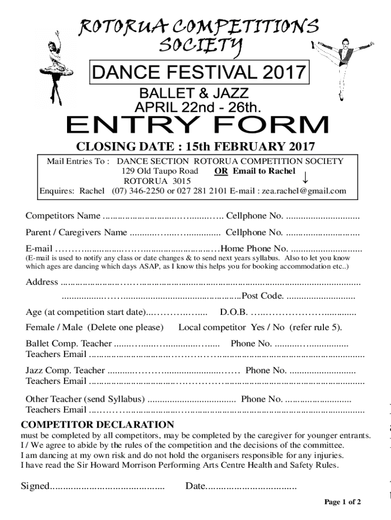 CLOSING DATE : 15th FEBRUARY 2017 Mail Entries To : DANCE SECTION ROTORUA COMPETITION SOCIETY 129 Old Taupo Road OR Email to Rachel ROTORUA 3015 Enquires: Rachel (07) 3462250 or 027 281 2101 Email