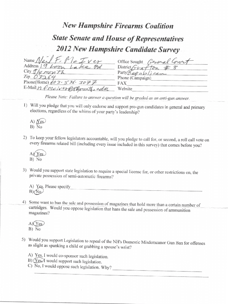 New Hompshire Firearms Coqlition State Senote and House of Representatives2012 New Hampshire Candidate Sarvey Name AddressCityzipQPhone (Campaign.lPhone(HomeEMailWebsite Please Note: Failure to unsv)er
