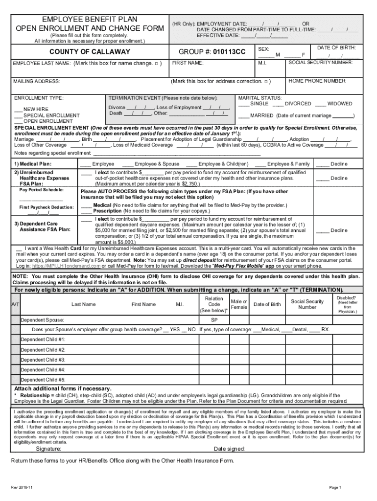 All information is necessary for proper enrollment.)COUNTY OF CALLAWAY(HR Only): EMPLOYMENT DATE: ___/___/___
