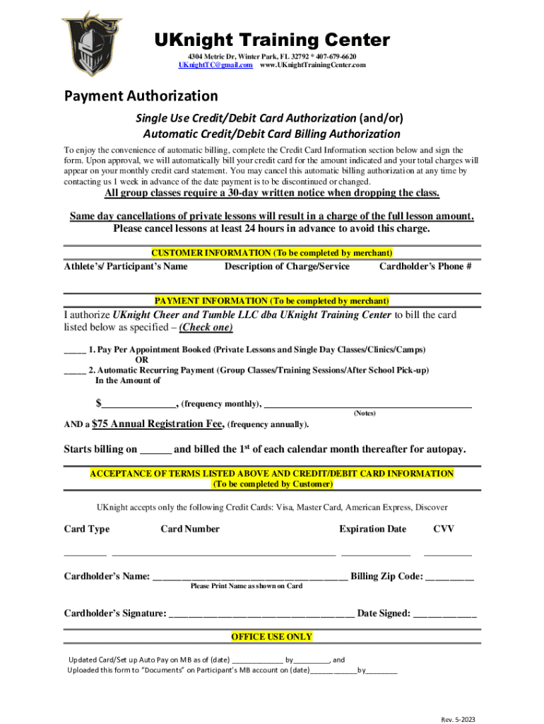 UKnight Training Center 4304 Metric Dr, Winter Park, FL 32792 * 4076796620 UKnightTC@gmail.com www.UKnightTrainingCenter.comPayment Authorization Single Use Credit/Debit Card Authorization (and/or)