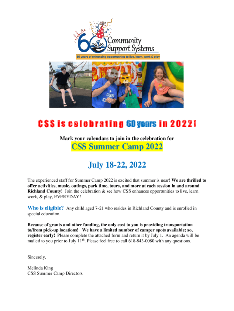 C S S i s c e l e b r a t i n g 60 years i n 2 0 2 2 ! Mark your calendars to join in the celebration forCSS Summer Camp 2022 July 1822, 2022 The experienced staff for Summer Camp 2022 is excited