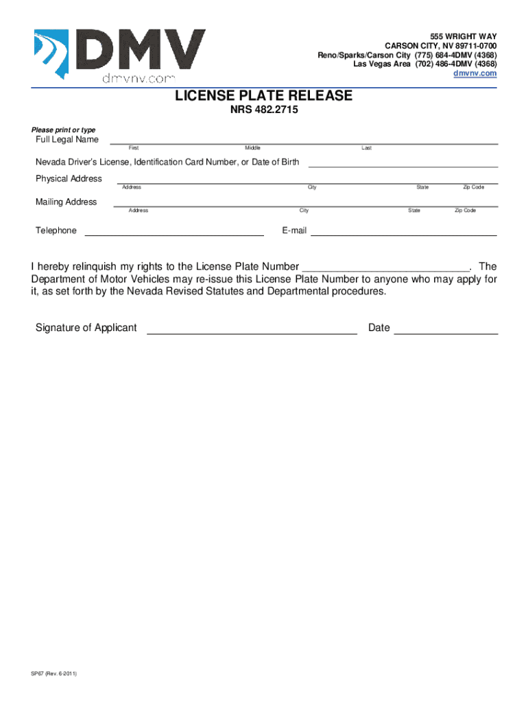 555 WRIGHT WAY CARSON CITY, NV 897110700 Reno/Sparks/Carson City (775) 6844DMV (4368) Las Vegas Area (702) 4864DMV (4368) dmvnv.comLICENSE PLATE RELEASE NRS 482.2715 Please print or typeFull Legal