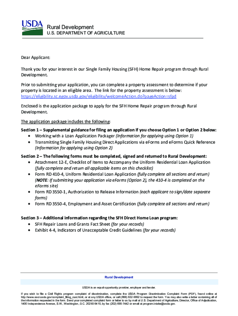 Rural DevelopmentU.S. DEPARTMENT OF AGRICULTUREDear Applicant: Thank you for your interest in our Single Family Housing (SFH) Home Repair program through Rural Development. Prior to submitting your