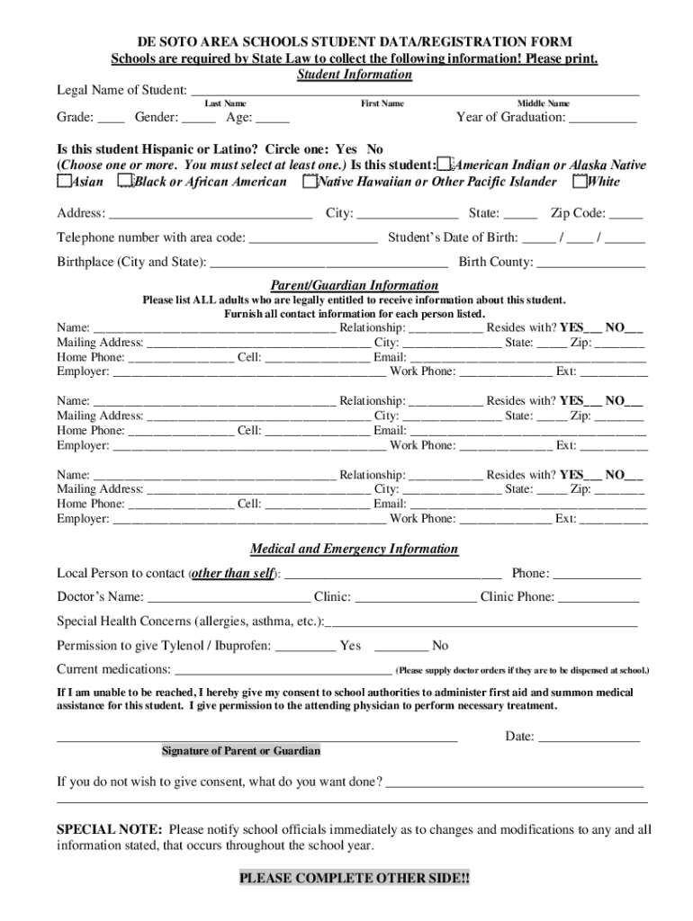 DE SOTO AREA SCHOOLS STUDENT DATA/REGISTRATION FORM Schools are required by State Law to collect the following information! Please print. Student Information Legal Name of Student: ___ Last NameFirst