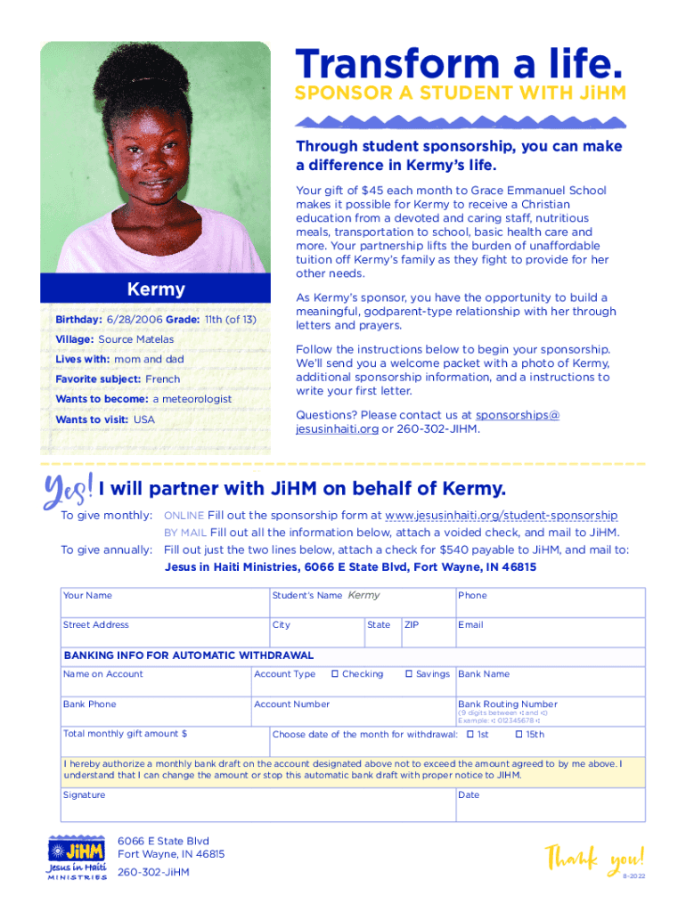 Transform a life.SPONSOR A STUDENT WITH JiHM Through student sponsorship, you can make a difference in Kermys life. Your gift of $45 each month to Grace Emmanuel School makes it possible for Kermy