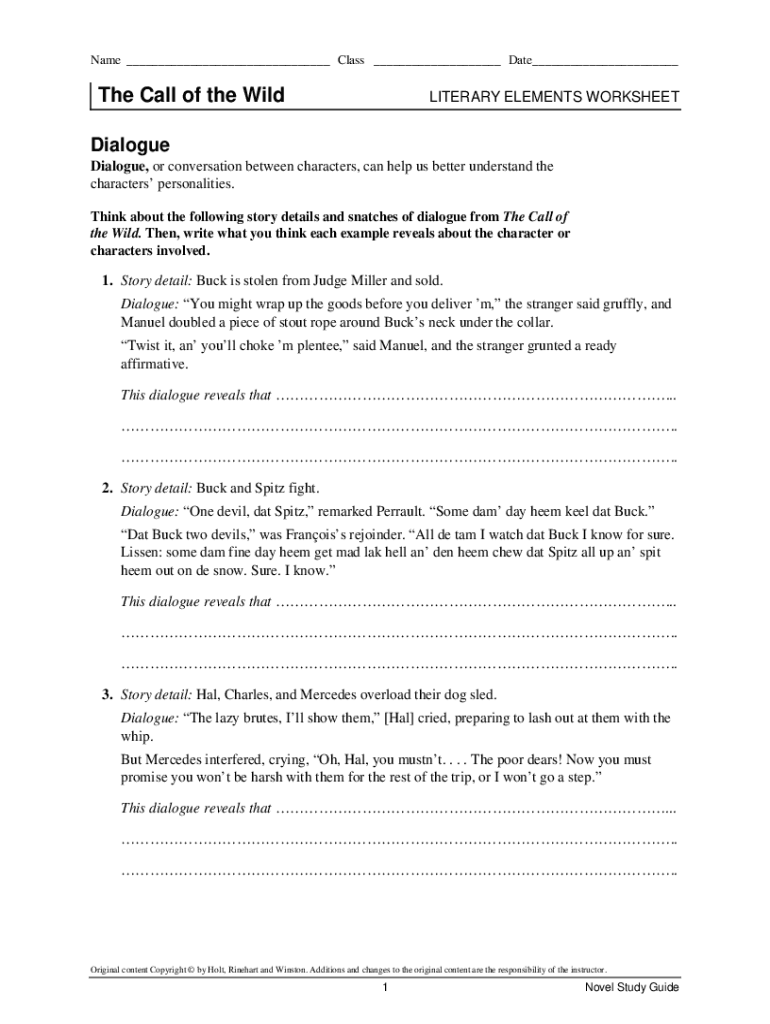 Name ___ Class ___ Date___The Call of the WildLITERARY ELEMENTS WORKSHEETDialogue Dialogue, or conversation between characters, can help us better understand the characters personalities. Think about