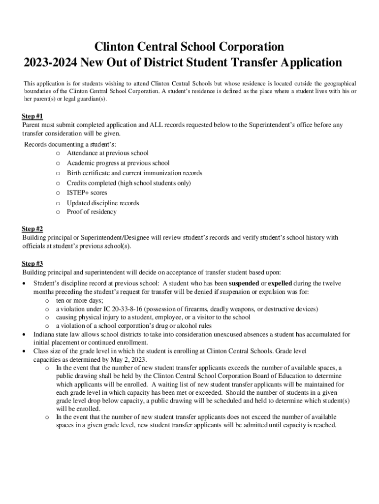 Clinton Central School Corporation 20232024 New Out of District Student Transfer Application This application is for students wishing to attend Clinton Central Schools but whose residence is located