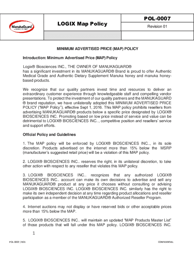 LOGIX Map PolicyPOL0007 Revision 01MINIMUM ADVERTISED PRICE (MAP) POLICY Introduction: Minimum Advertised Price (MAP) Policy Logix Biosciences INC., THE OWNER OF MANUKAGUARD has a significant investment
