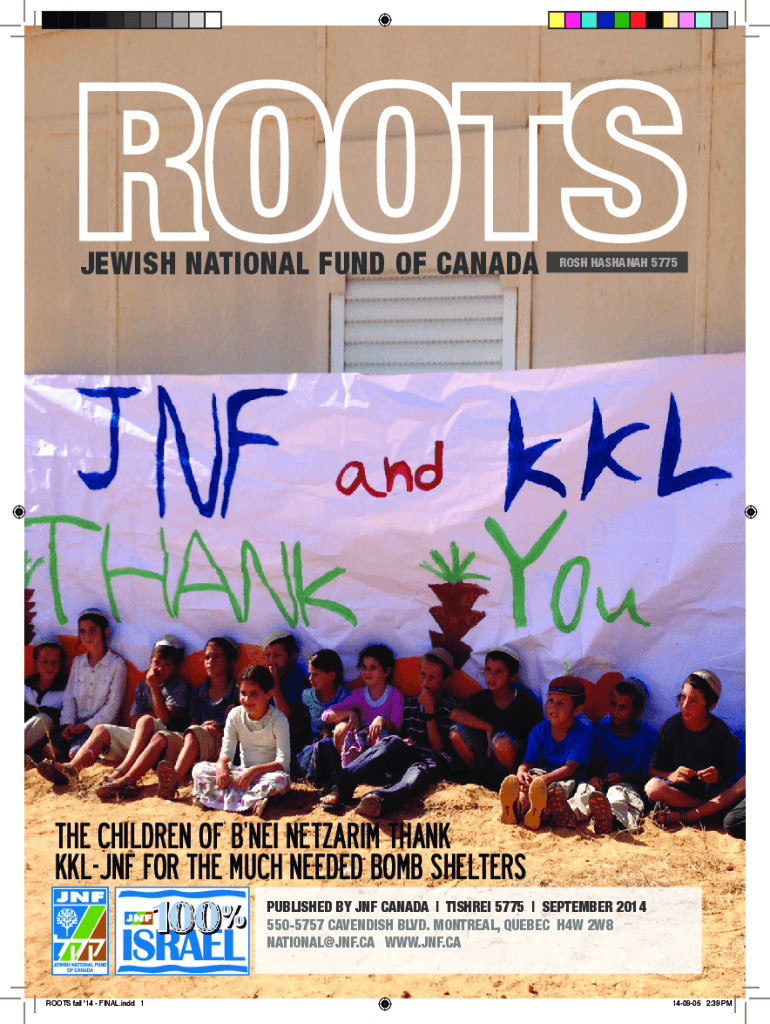 JEWISH NATIONAL FUND OF CANADAROSH HASHANAH 5775THE CHILDREN OF B\'NEI NETZARIM THANK KKLJNF FOR THE MUCH NEEDED BOMB SHELTERS PUBLISHED BY JNF CANADA | TISHREI 5775 | SEPTEMBER 2014 5505757 CAVENDISH