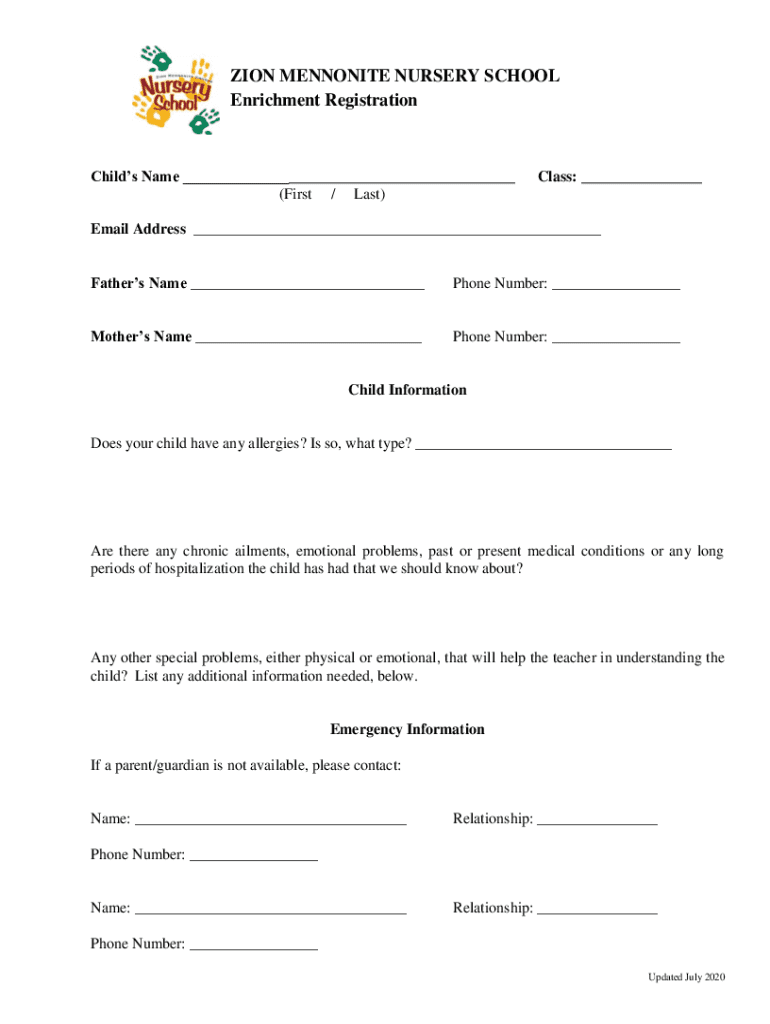 ZION MENNONITE NURSERY SCHOOL Enrichment RegistrationChilds Name ___ (First / Last)Class: ___Email Address ___ Fathers Name ___Phone Number: ___Mothers Name ___Phone Number: ___Child InformationDoes